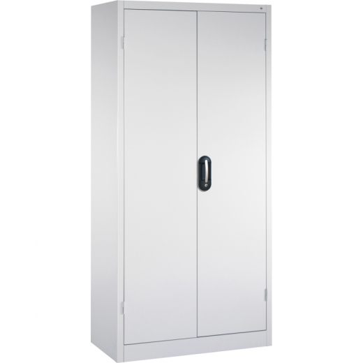 Langlebige Stahlkonstruktion mit hochwertiger Einbrennbeschichtung. Mittige Türverstärkung für hohe Türstabilität, verdeckte Schließstangen. Alle Schränke mit 3-riegeligem Muldengriffschloss "Ergo-Lock" inkl. 2 Schlüsseln, mit patentiertem Mechanismus: Zum Schließen einfach zudrücken! Auch mit Handschuhen leicht bedienbar. Breite Maßpalette für jeden Verwendungszweck. Hohe Traglast pro verzinktem Einlegeboden 110 kg. Türöffnungswinkel ca. 180° durch außenliegende Scharniere. Schranklast 700 kg.