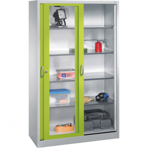 Stahl-Schiebetürenschrank Acurado mit Fenster für direkten Einblick. Leichtgängige Bedienung durch Leichtlaufrollen in spezieller Schienenführung. Zentralverschluss mit Wechselzylinder. Ergonomische Design-Griffe. Achtung: Anlieferungsmöglichkeit durch Sattelschlepper muss gegeben sein.